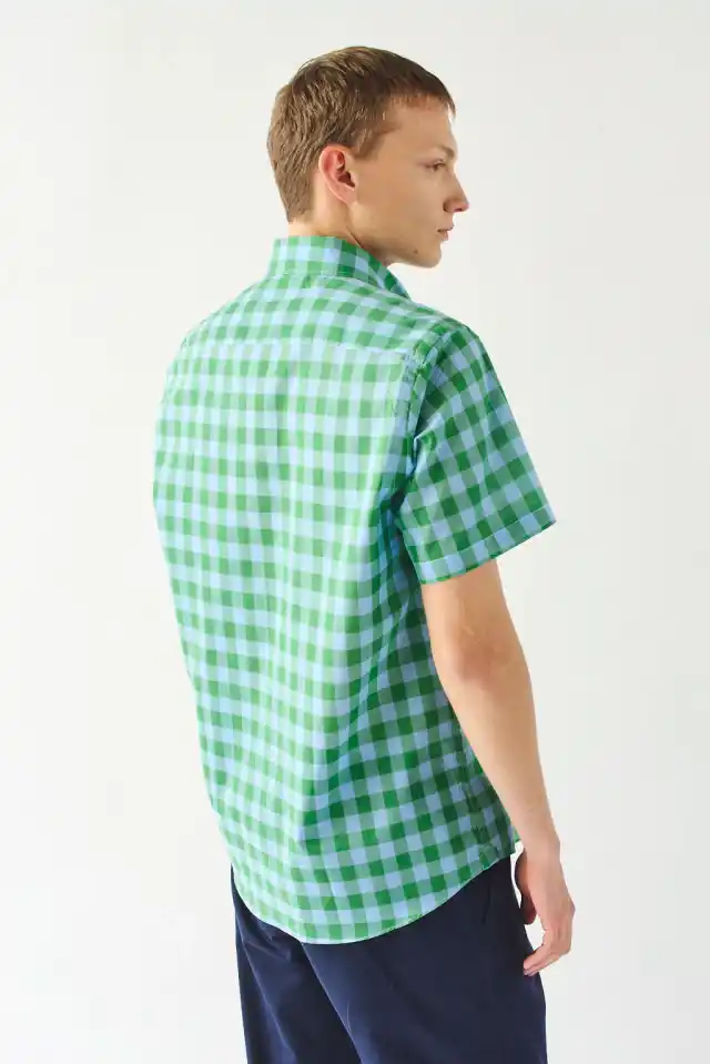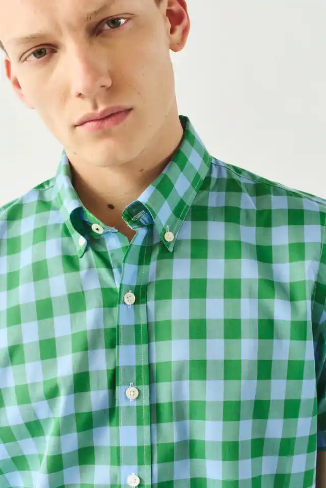 Camisa de tela liviana de calce regular manga corta con cuello boton down. Etiqueta bordada en carterón.